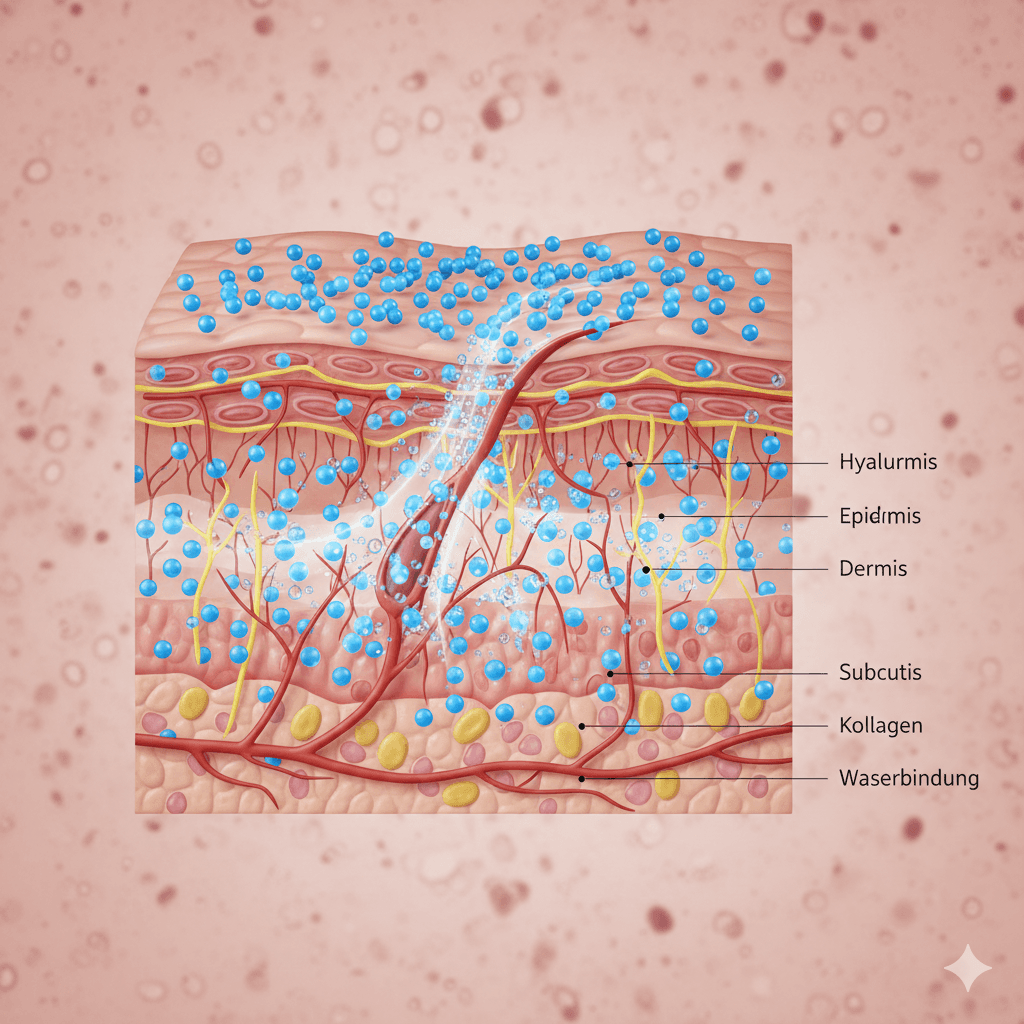 Wenn das Hyaluron in die Schichten eindringt, bindet es Feuchtigkeit und unterstützt die Geschmeidigkeit des Gewebes.